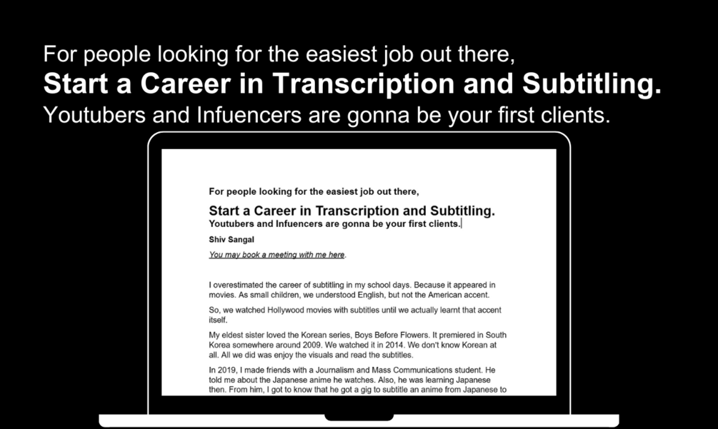 After this, you can start approaching youtubers, influencers, content creators and businesses investing hugely in their videos and looking for subtitles.